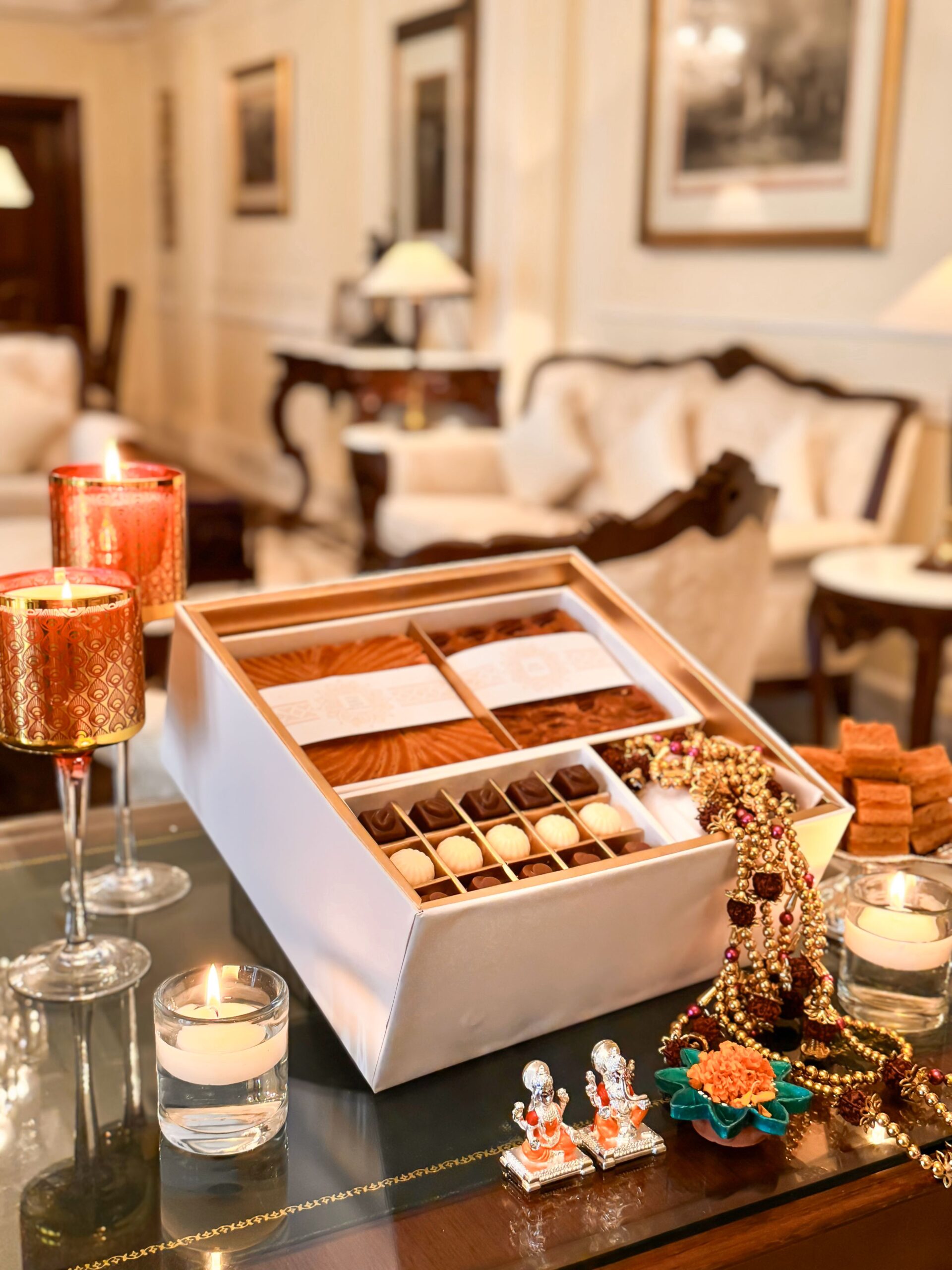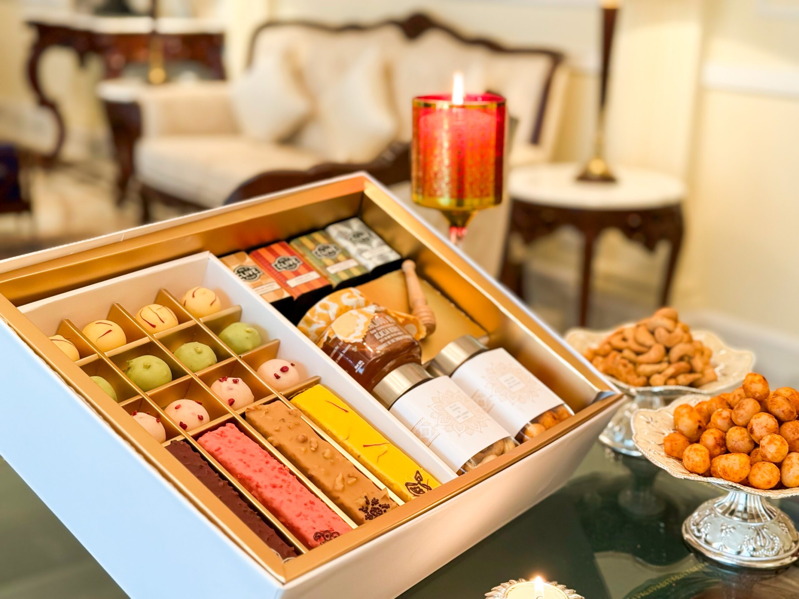 このコレクションは、厳選された2つのボックスで構成されています。一つは「アーティザナル」。時代を超えた味わいの手作りフィナンシェ、贅沢なミニトラベルケーキ、プレミアムナッツ、ヒマラヤハニー、そして特製紅茶を詰め合わせたボックスです。もう一つは「コンティ」。洗練された技で作られた、洗練されたグルメな逸品の数々。ディワリの温かさを感じさせながら、あらゆるお祝いを思い出深いものにしてくれます。